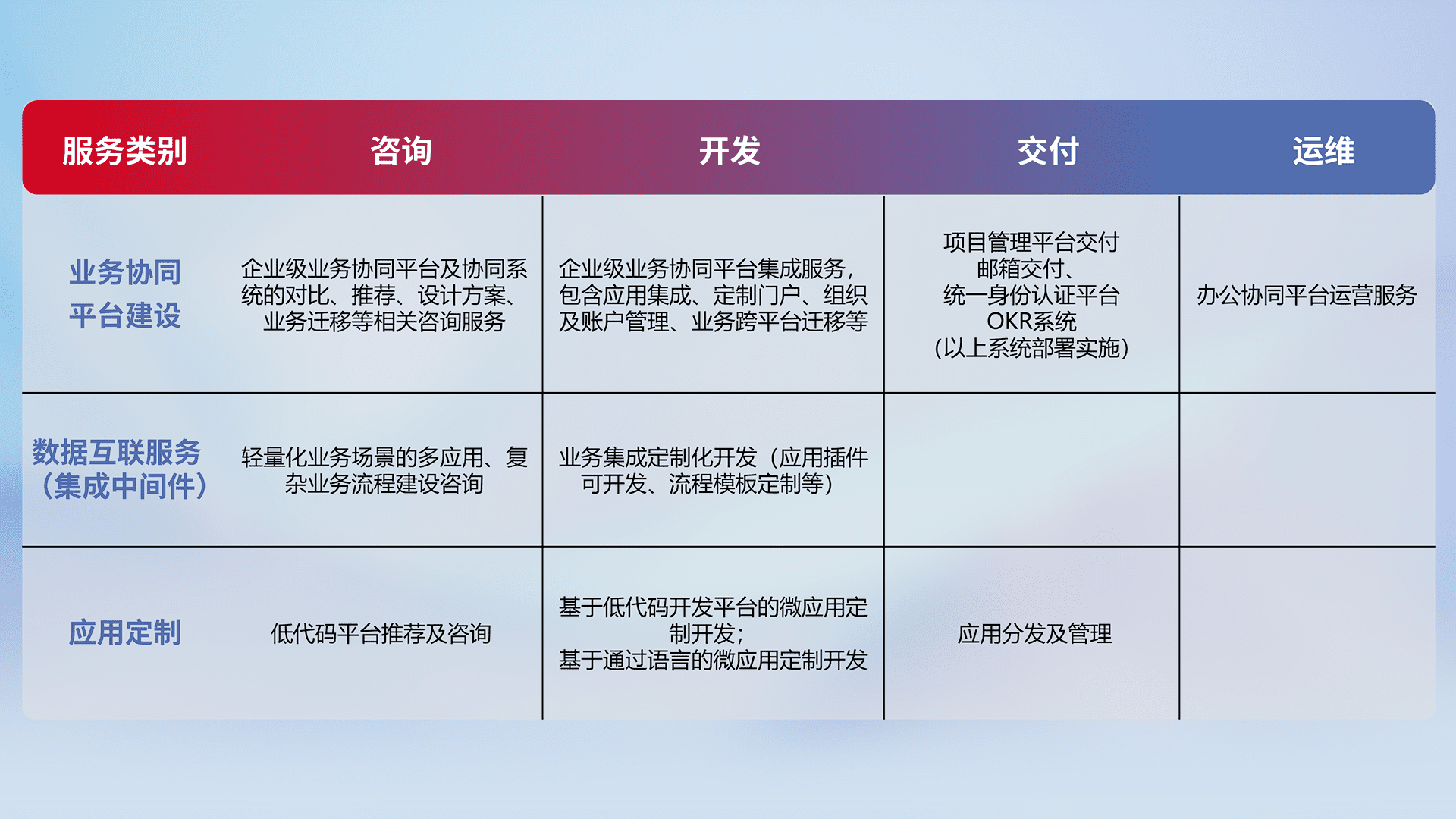 针对钉钉、、、、企微、、、IDaas等平台级产品提供产品的规划、、、、方案、、、、交付、、定制化开发等服务,,实现如统一协同办公、、、、智能客户服务、、、、混合会议管理、、、、智能数据查询、、等业务场景,,实现数字化转型。。。