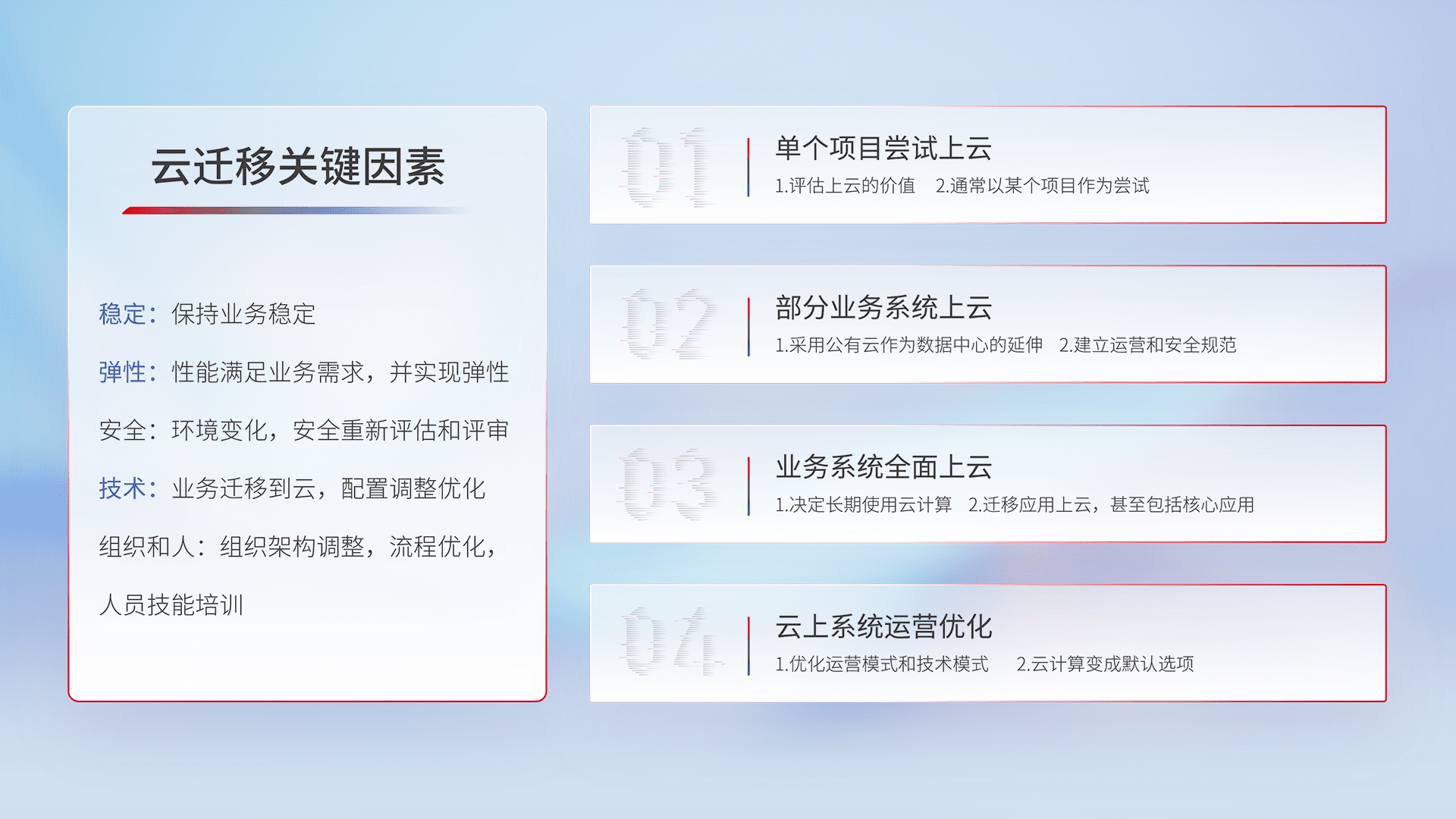 结合实际业务,,,,从规划设计、、、、云平台选型、、、、云原生改造、、、数据迁移、、、、集成交付,,迁移全过程为客户识别最佳上云路径,,,做好风险识别管理,,设计网络架构、、、身份权限、、、、安全审计合规、、、、操作审计、、日志审计、、监控告警策略、、、、多站点容灾设计等,,对云上基础设施进行整体规划,,,,提升IT治理水平,,,,以满足弹性、、、、高可用、、、、高性能的需求。。。。