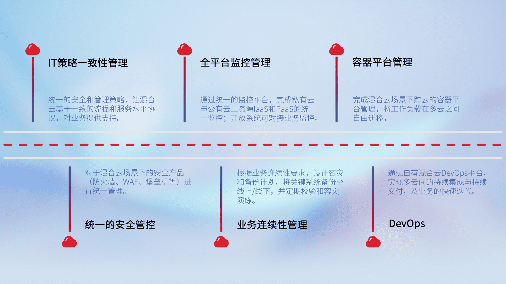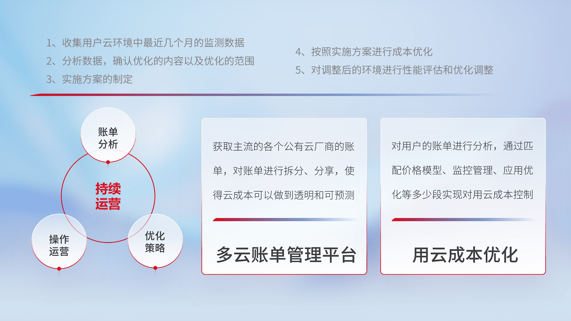 通过多云纳管,,,以统一的资源数据模型把客户的云资源进行抽象和封装,,,,进而实现对多云资源的统一操作,,,,保障云资源管理的可靠性、、、、稳定性与可用性。。量身定制化运维内容,,配置、、、、开发运维、、补丁管理、、、备份、、、监控、、认证和访问管理、、、、审计和日常巡检等,,保障在用云过程中的可靠度,,稳定度以及高可用率。。